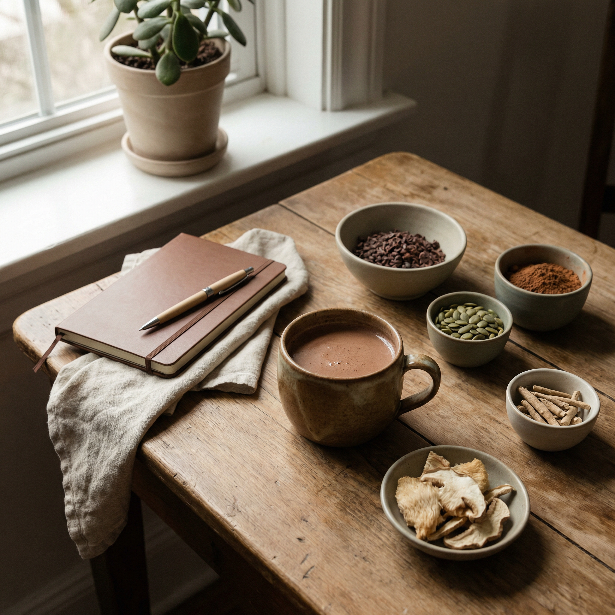 Pure ceremoniële cacao, geselecteerd op herkomst en verrijkt met natuurlijke kruiden voor focus, rust of verbinding.